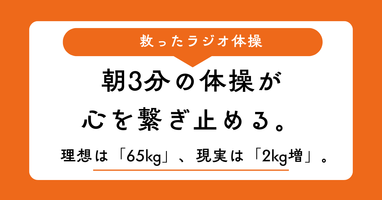 そんな私に、ラジオ体操は**「継続の合格ライン」**を教えてくれた。 どれだけ前夜に食べ過ぎても、どれだけ体重が増えていても、朝起きて体操さえすれば、その日の私は「自分との約束を守った男」として100点からスタートできるのだ。