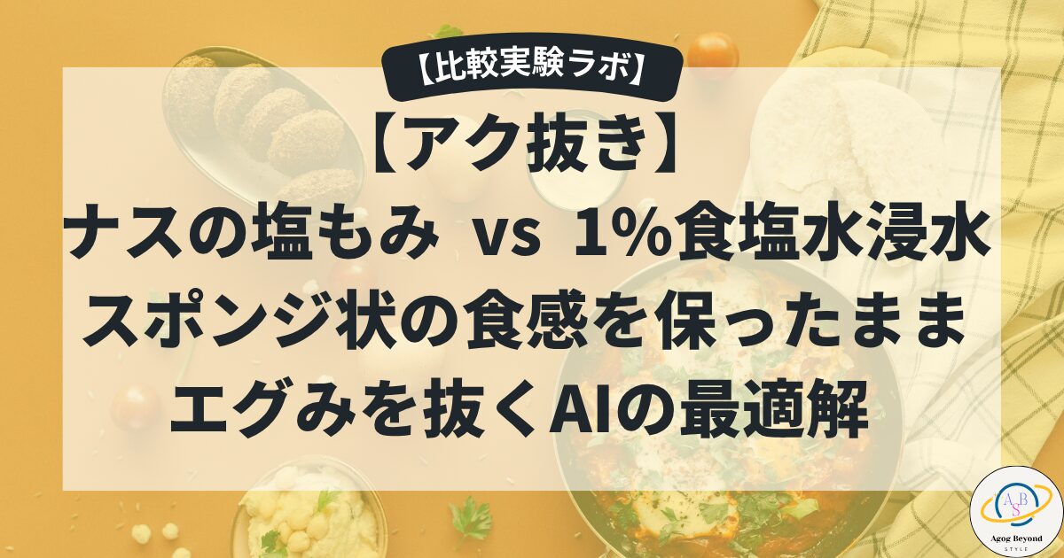今日は、48歳の私が長年コツコツと続けてきた「私の塩もみ」を捨て去り、AIが導き出した「1%食塩水への浸水」というロジックで、ナスのエグみを抜きながら最高の食感を保つ、リアルタイム検証ドキュメンタリーをお見せしよう。