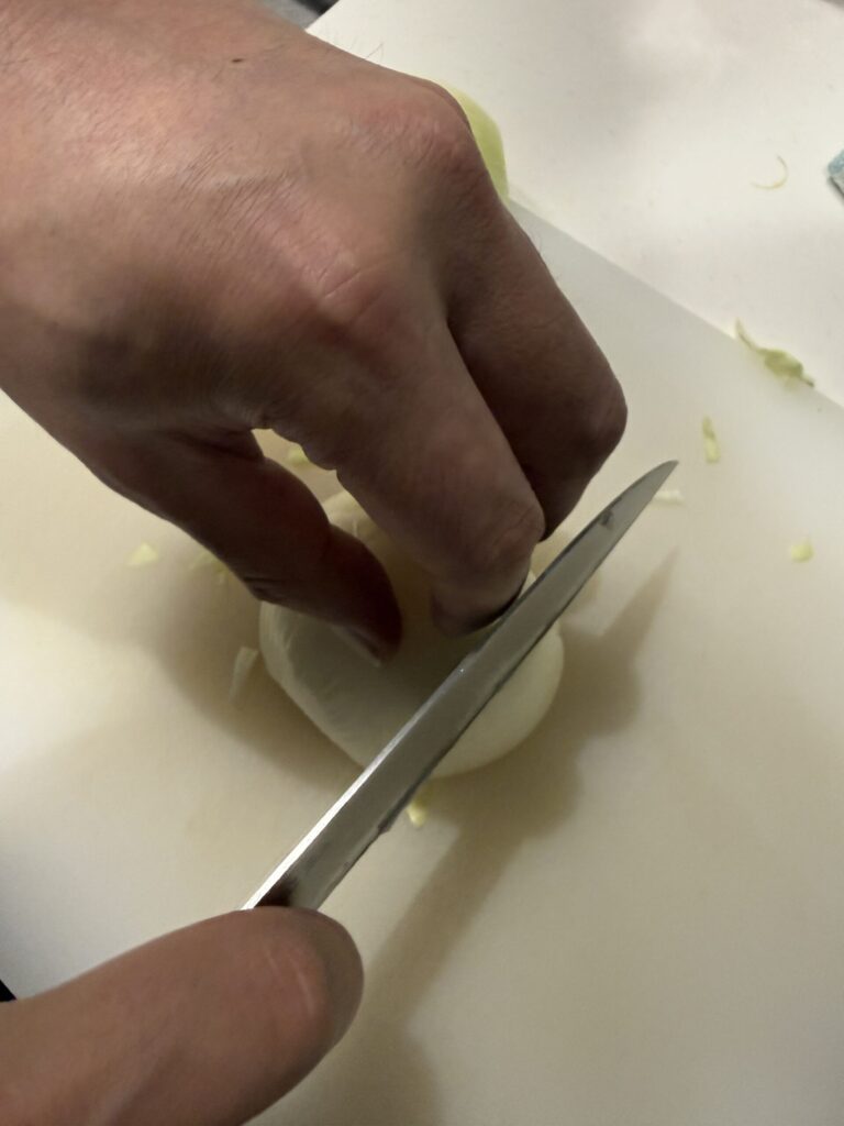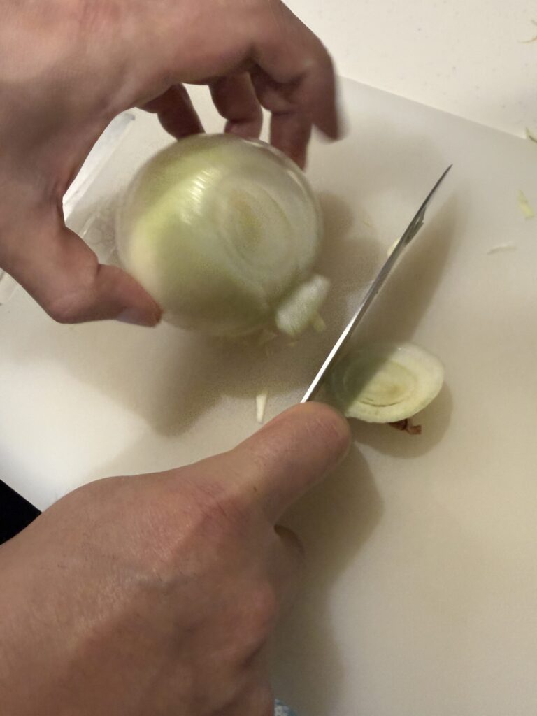 鋭利な刃で細胞を乱暴に壊すため、玉ねぎから余計な水分と辛味成分が流れ出し、料理全体の味をぼやけさせます。